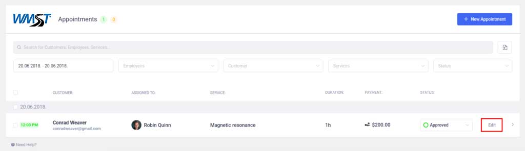 It often happens, that you need to make changes to an existing appointment. Maybe the customer needs to reschedule their appointment, or maybe an employee is unexpectedly out of the office. To edit an existing appointment, simply click on the “Edit” button to the right of the appointment you want to change.