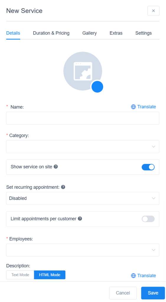 Service photo – Click on the photo placeholder, upload the picture and this picture will appear on the back-end and on the front-end for that service. Please only use square images 500px x 500px