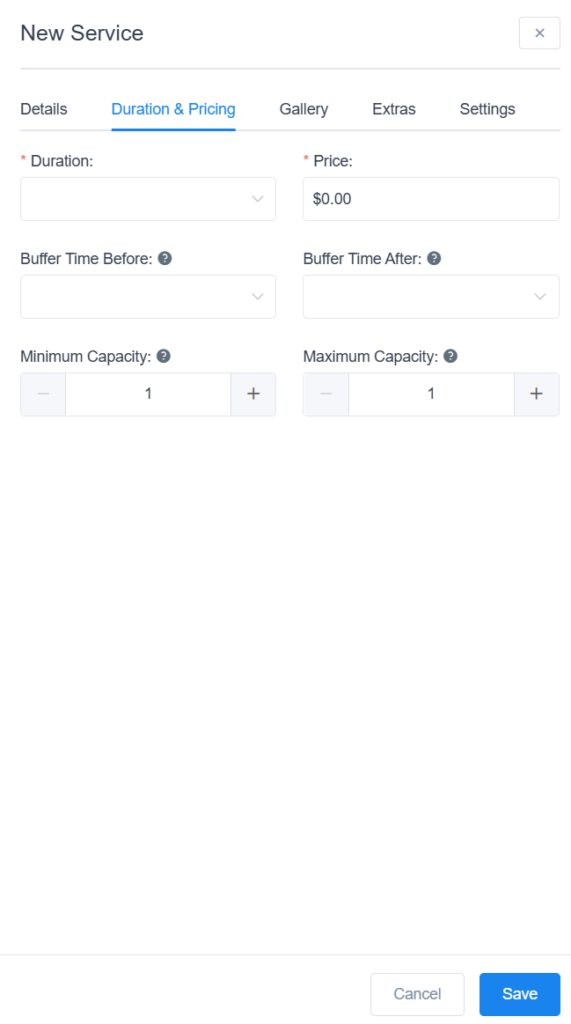 Duration – If you want to define additional services and give them a duration, this is where you do it. Duration is not required because there can be extras that your customers can buy without affecting the appointment’s duration (e.g. special equipment).