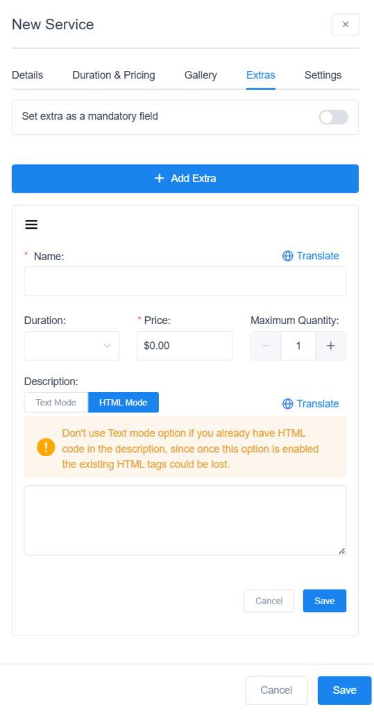 Description – Like in the service dialog, this is where you add a description about this extra that will appear on the “Front-end Booking Catalog”. Same as the Extra name you can also translate the extra description using the “Translate” option beside the description and use it on a multilingual website.