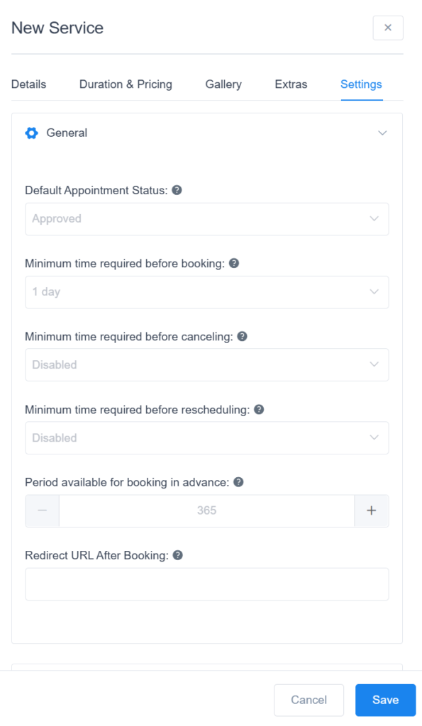 Some of the General Settings that are applied to all services, can be set for each service separately as well. You can set these options to be different per service: default appointments status, minimum time required before booking, minimum time required before canceling/rescheduling, the period available for booking in advance, and redirect URL after booking. You will find these options when you create or edit a service under the Settings tab. By default, these settings will have the same values as in General Settings.