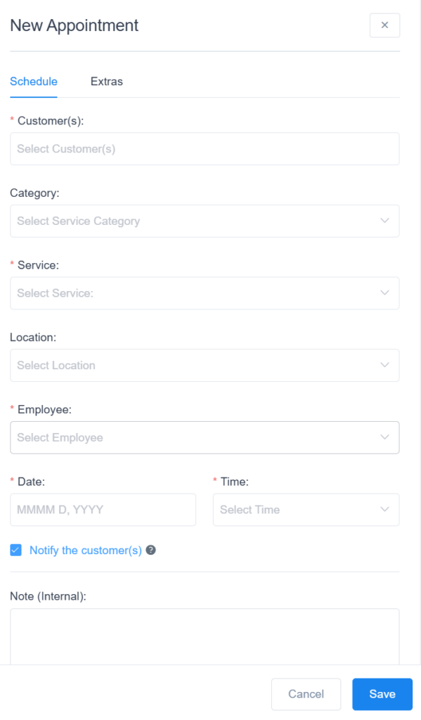 • “Schedule”: Use this field that you must populate pane to create a new appointment. “Customer(s)”, “Service”, “Employee”, “Date”, and “Time” are mandatory and you need to populate these fields to schedule a new appointment. There is no specific order in selecting “Customer(s)”, “Service” and “Employee”, but before you can choose the appointment date, you have to populate these three fields. After selecting the date, you will be able to select the time of the appointment: