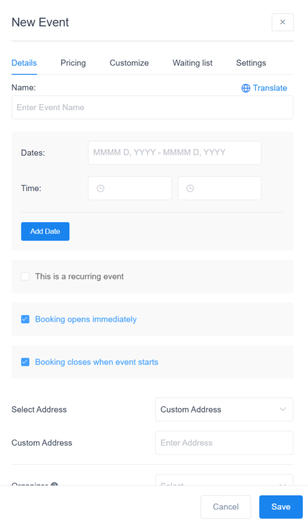 Name – For every event you can set up the event name. The event name will be shown on the Event front-end list for booking and because of that this field in the modal is mandatory. Besides the name, you will see the “Translate” option so you can write a name in multiple languages and show it on the multilingual website.
