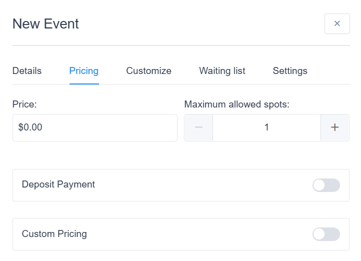 Pricing – is the second tab when creating an event. Here you manage the price and deposit options for the event. You can set one price for the event or custom pricing with different pricing categories and pricing by date range options.