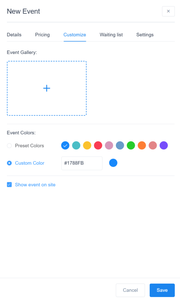Event Colors – Here you can set the color in which your event will be shown on the front-end event list. This color will not be applied to the whole event, instead, it will be applied to the buttons in the event, calendar, and price. You can choose one of the preset colors or you can add custom color by writing its code.