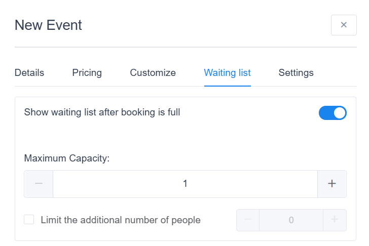 It’s important to note that the Waiting List has its own capacity. For example, if your event is configured for 20 people, setting the maximum capacity of the waiting list to 10 means that once 20 attendees book the event, an additional 10 people can join the waiting list.