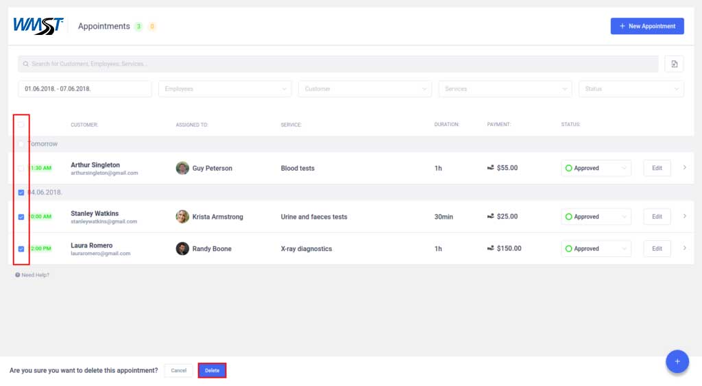 You can delete multiple appointments at the same time by checking the appointments you want to delete. The dialog box will appear in the table footer when you check at least one appointment you want to delete. Once you are certain you want to delete the records click the “Trash” icon and then the “Delete” button.