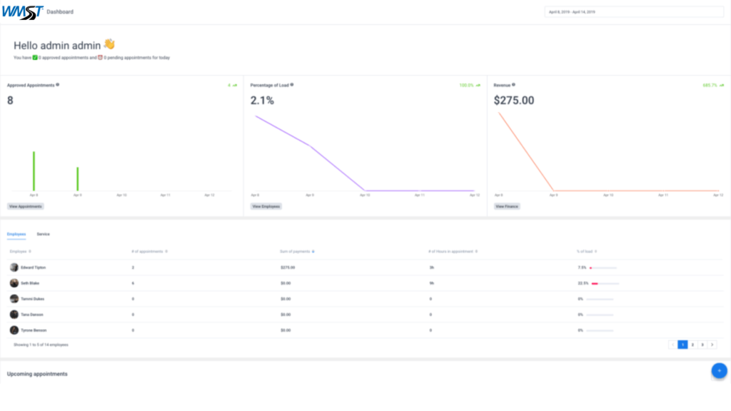 The “Dashboard” page is the first page that appears upon opening the Course & Test Scheduler. The “Dashboard” view summarizes monitoring information about all appointments, services, employees, and revenue. The dashboard is divided into three main sections, providing different information in each.
