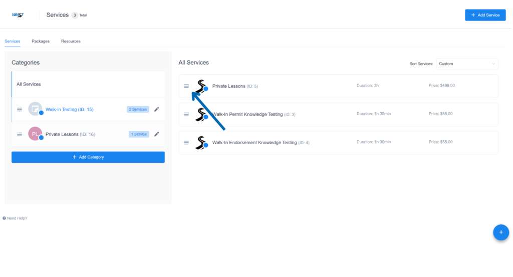In the “Sort Service” dropdown you have four main options: Name Ascending, Name Descending, Price Ascending, and Price Descending, but you also have Custom as an option which will be automatically chosen if you move any service on the list with drag and drop option. For making the custom order by drag and drop, just click on the burger icon which you will see on each service, and drag and drop the service on the list.