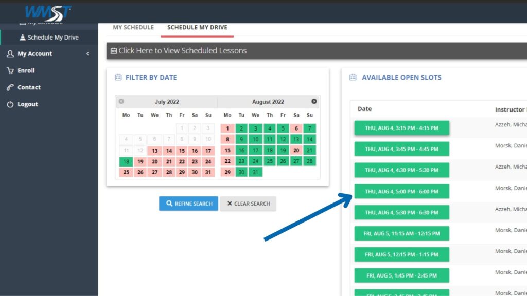 On the left you will find  a list of menu options, hover over scheduling and click on Schedule My Drive
